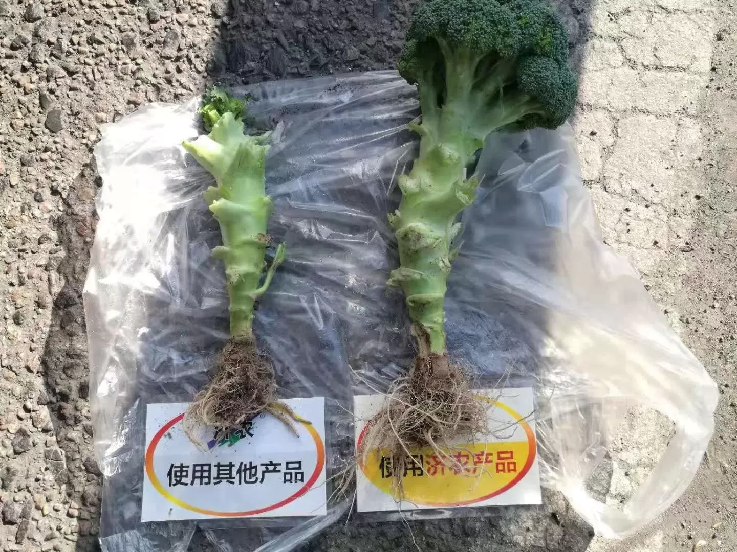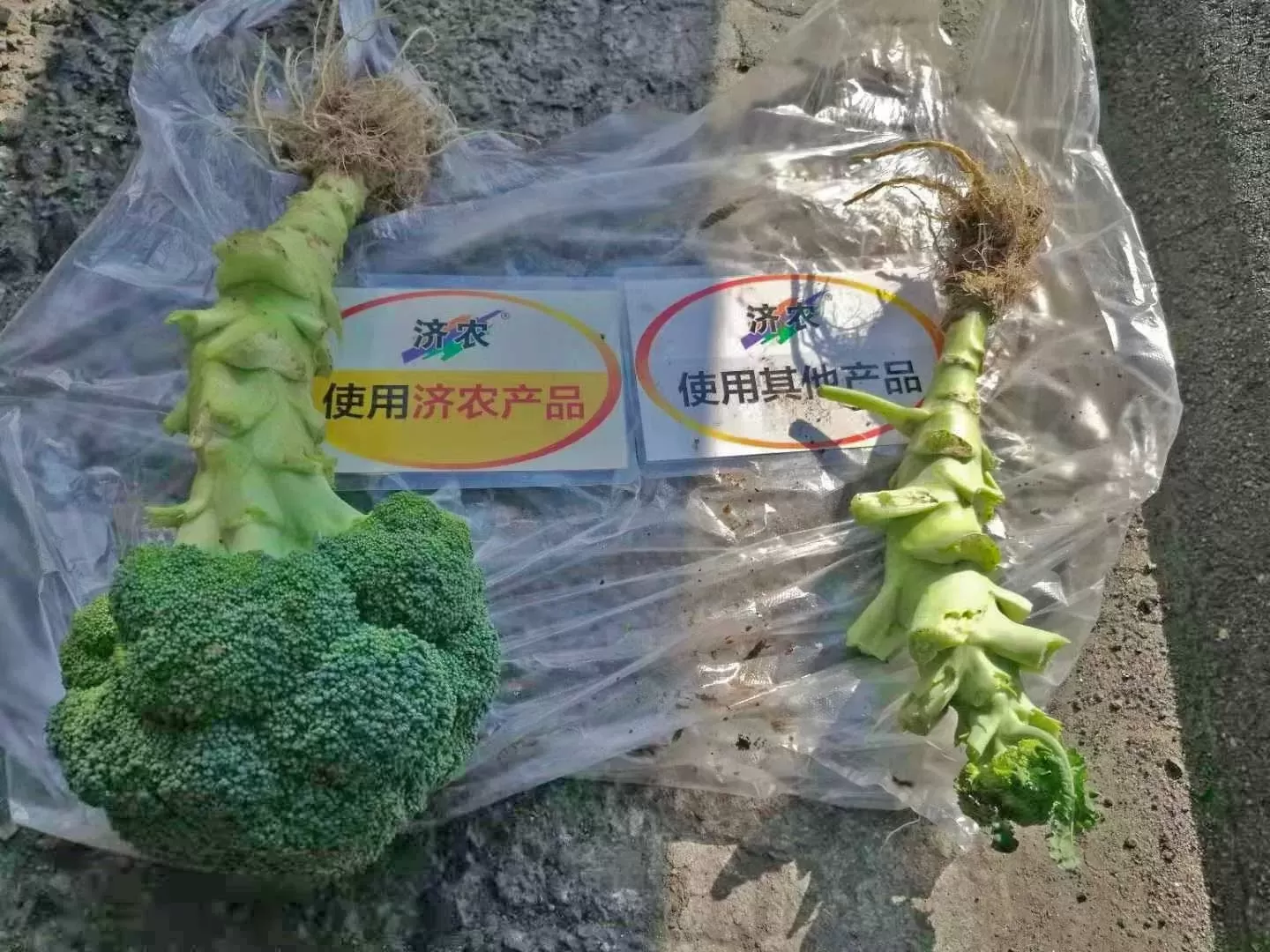 The broccoli planted at the same time, after using Jinong humic acid fertilizer twice, had thick stems, white and numerous capillary roots, developed root systems, and even advanced growth cycles by about a week; Using broccoli from other products, with thin stems and small root discs.