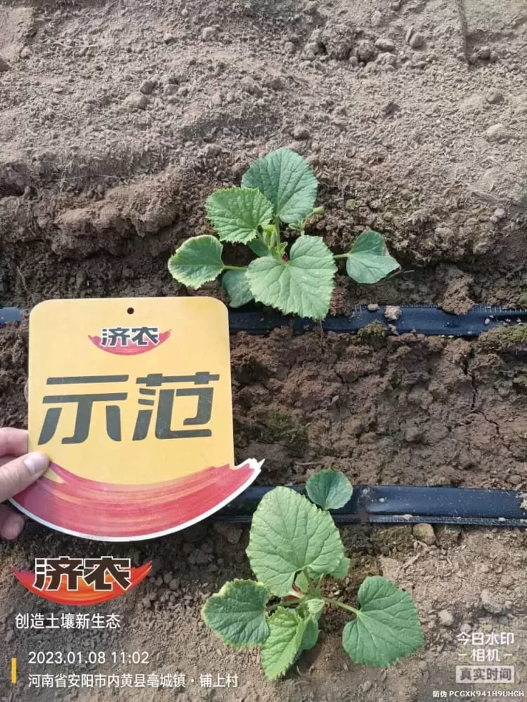 产品用量:定植水冲施济农大嘴根,一亩地1kg。叶面喷施济农800,一喷雾器20mL。