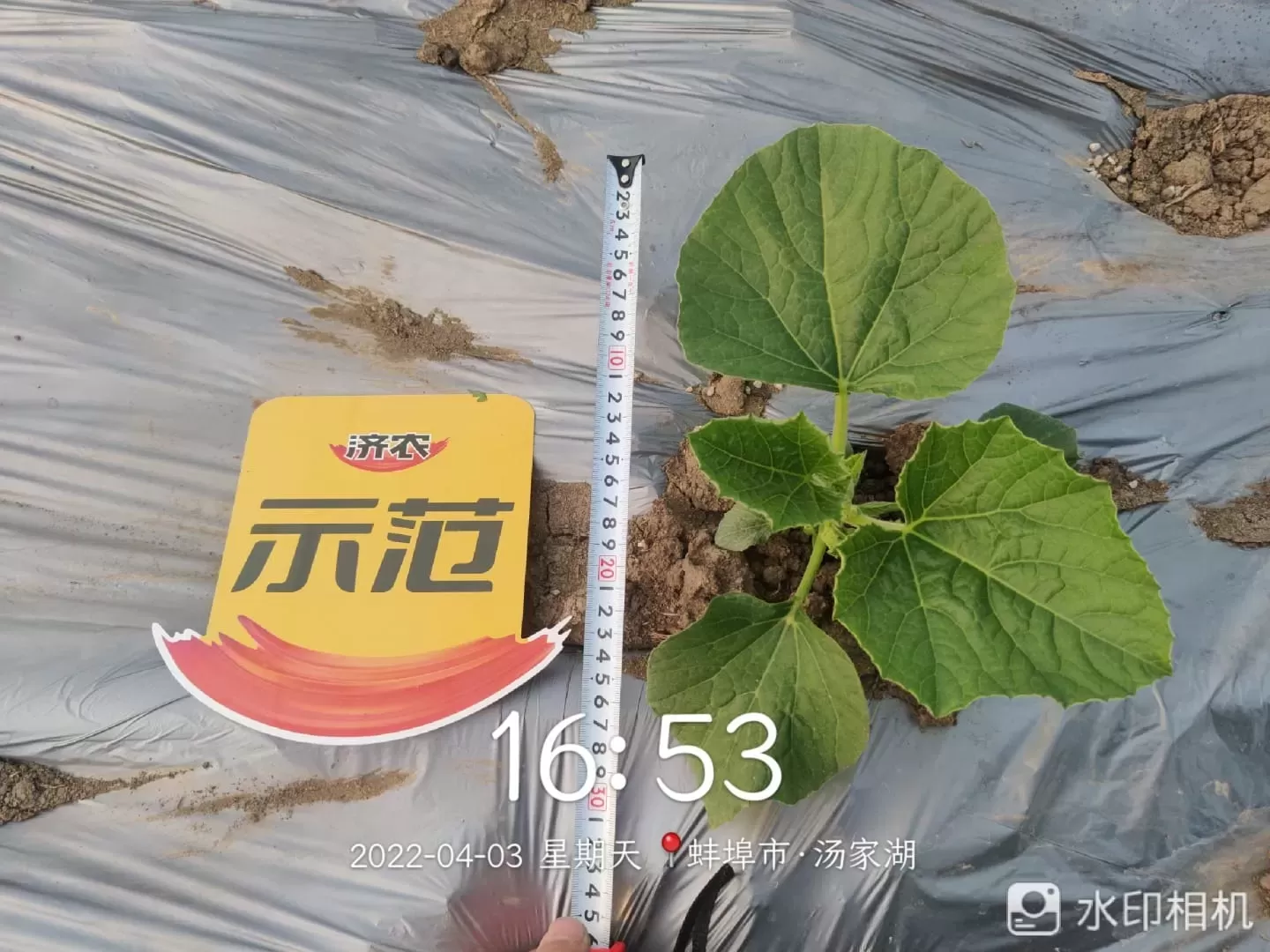 4月3日,第一次观察示范效果。用济农乐活组合的瓠瓜开展度更大,叶片平展,这样的苗子说明根系活力强,吸水吸肥能力强。对照的瓜苗叶片稍卷。