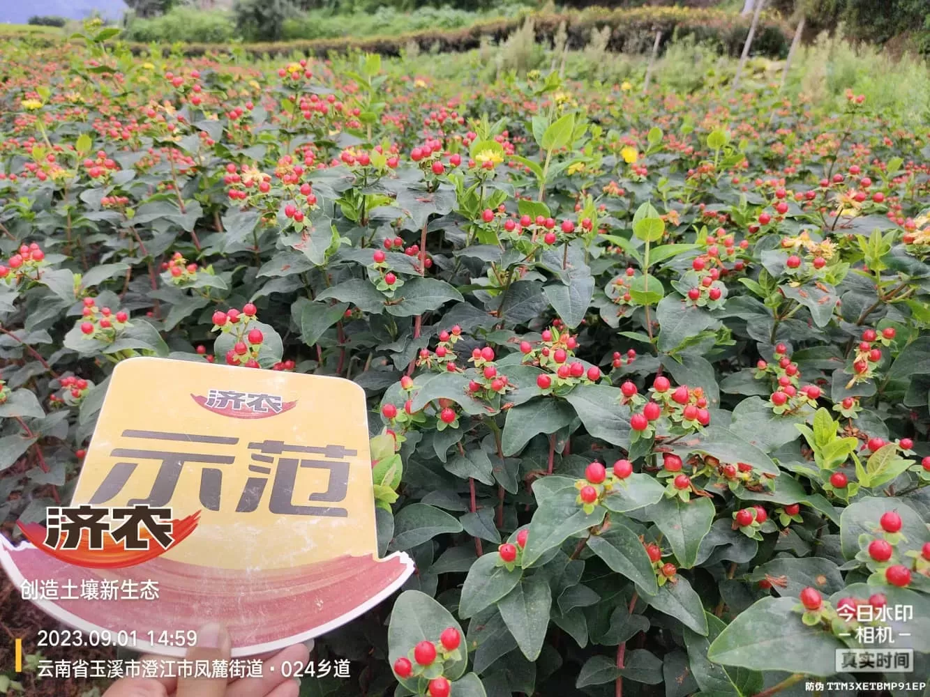 实验组火龙珠果实大,色泽鲜靓,个头均匀,没有畸形果,植株健壮,叶片肥厚平展,柔韧有光泽,花期提前十天左右,剪完枝的老桩上发出的新芽多,叶片颜色绿。对照组没有使用我司产品,花期晚,花期不一致,果实以及叶片整体小于试验组,色泽也没有实验组靓,新芽少,叶片颜色淡。